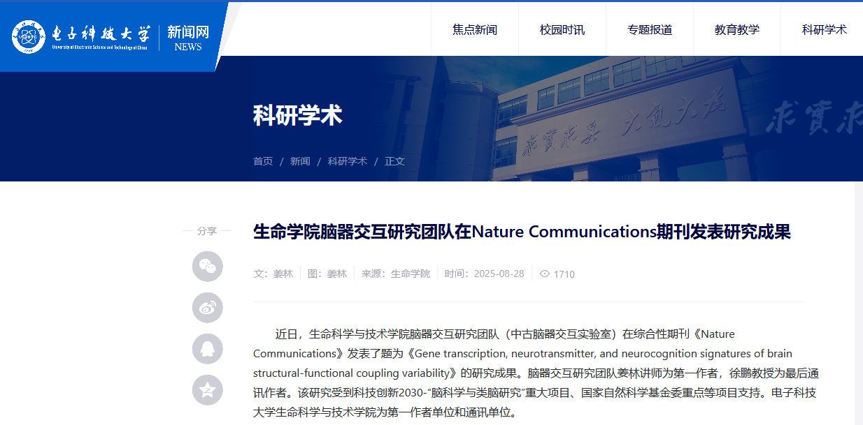 近日,生命科学与技术学院脑器交互研究团队(中古脑器交互实验室)在综合性期刊《Nature Communications》发表了题为《Gene transcription, neurotransmitter, and neurocognition signatures of brain structural-functional coupling variability》的研究成果。脑器交互研究团队姜林讲师为第一作者,徐鹏教授为最后通讯作者。该研究受到科技创新2030-“脑科学与类脑研究”重大项目、国家自然科学基金委重点等项目支持。电子科技大学生命科学与技术学院为第一作者单位和通讯单位。