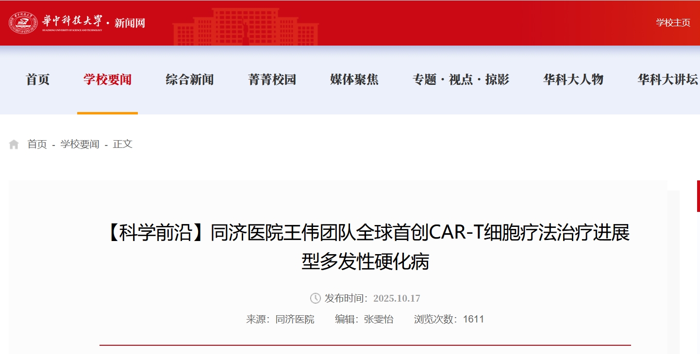 新闻网讯(通讯员 田娟)10月15日,同济医学院附属同济医院神经内科王伟教授、田代实教授、秦川教授团队在国际学术期刊《细胞》(Cell)上发表重大研究成果,全球首次证实一种CAR-T疗法,“自体靶向B细胞成熟抗原的嵌合抗原受体T细胞”在治疗进展型多发性硬化病的安全性和有效性。