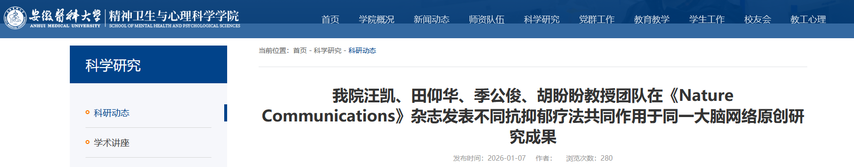 2026年1月,精神卫生与心理科学学院、第一附属医院神经内科汪凯教授团队,在抑郁症治疗的神经影像学机制研究领域取得重要进展。研究成果以《不同抗抑郁疗法作用于共同的脑网络(Distinct antidepressant therapies act on a common brain network)》为题,发表于《自然》子刊《自然-通讯(Nature Communications)》。该研究揭示,虽然抗抑郁疗法多种多样,但它们最终都作用于一个共同的大脑网络,双侧杏仁核是这一网络的核心脑区。精神卫生与心理科学学院季公俊教授、博士研究生许文强、博士研究生张娟(现已毕业工作于省立医院)、第二附属医院医师李倩倩为论文的共同第一作者,汪凯教授、胡盼盼教授、田仰华教授为通讯作者。