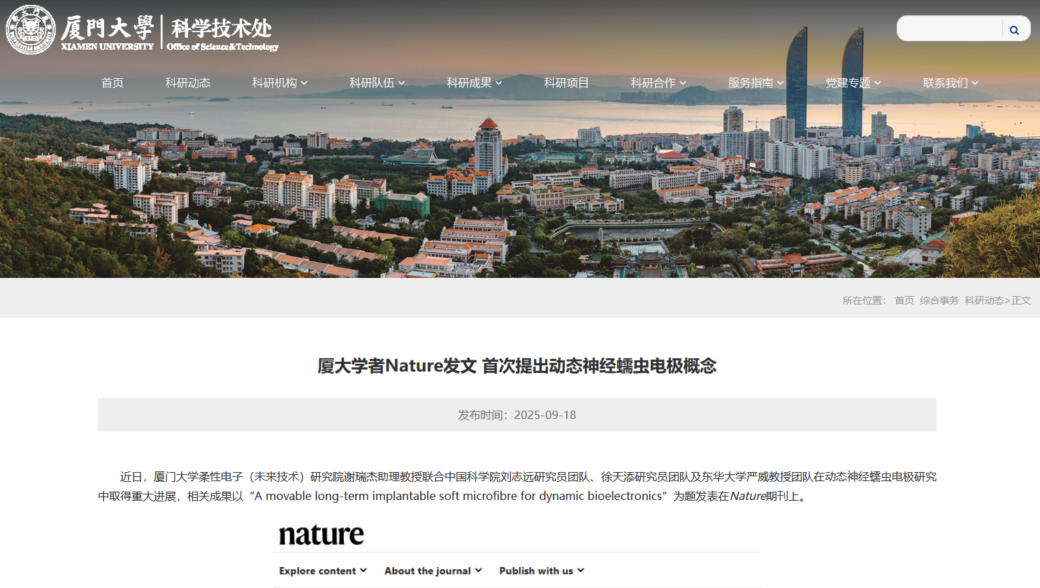 近日,厦门大学柔性电子(未来技术)研究院谢瑞杰助理教授联合中国科学院刘志远研究员团队、徐天添研究员团队及东华大学严威教授团队在动态神经蠕虫电极研究中取得重大进展,相关成果以“A movable long-term implantable soft microfibre for dynamic bioelectronics”为题发表在Nature期刊上。