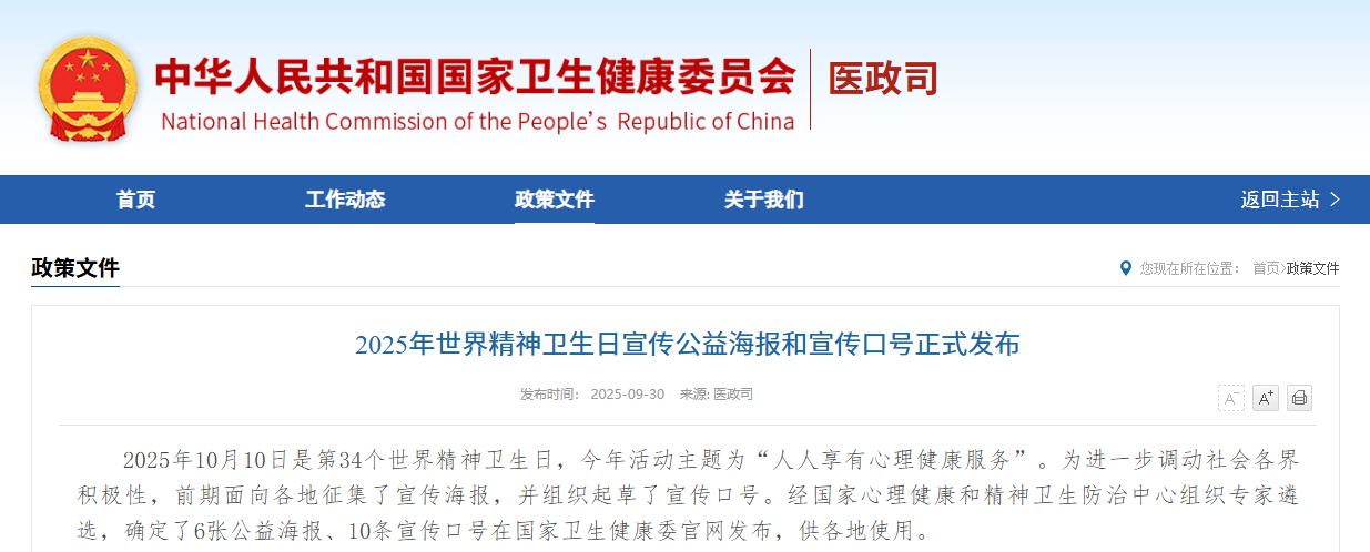 2025年10月10日是第34个世界精神卫生日,今年活动主题为“人人享有心理健康服务”。为进一步调动社会各界积极性,前期面向各地征集了宣传海报,并组织起草了宣传口号。经国家心理健康和精神卫生防治中心组织专家遴选,确定了6张公益海报、10条宣传口号在国家卫生健康委官网发布,供各地使用。